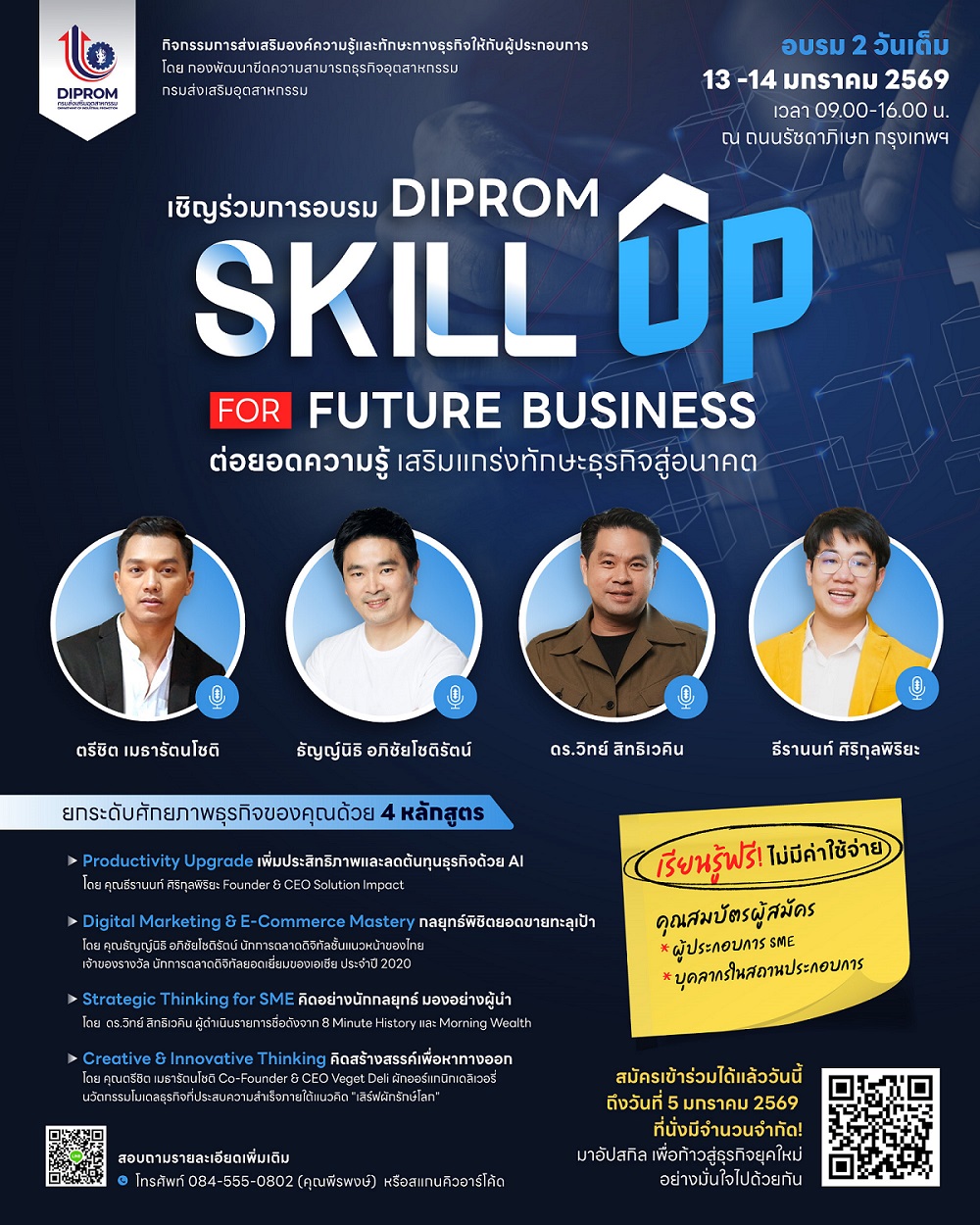 📢กรมส่งเสริมอุตสาหกรรม เชิญชวนผู้ประกอบการที่ต้องการเพิ่มศักยภาพธุรกิจ ร่วมกิจกรรมการอบรม “DIPROM SkillUp for Future Business ต่อยอดความรู้ เสริมแกร่งทักษะธุรกิจสู่อนาคต” กับ 4 หลักสูตรที่จะช่วยเพิ่มขีดความสามารถให้ธุรกิจคุณพร้อมรับการเปลี่ยนแปลงของโลกดิจิทัล