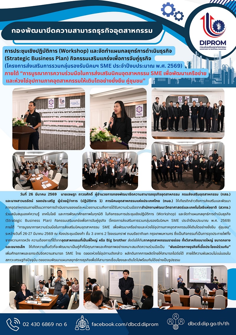 กองพัฒนาขีดความสามารถธุรกิจอุตสาหกรรม จัดประชุมเชิงปฏิบัติการการจัดทำแผนกลยุทธ์การดำเนินธุรกิจ โครงการส่งเสริมการรวมกลุ่มรองรับนิคม SME ประจำปีงบประมาณ 2569